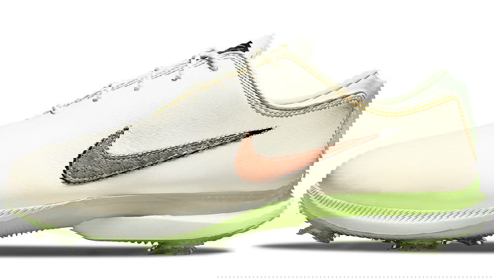 The Nike Air Zoom Victory Tour 2 golf shoe is ready to drop ahead of the 149th Open Championship and builds upon its predecessor in almost every department. The full grain leather upper has a soft and supple feel with a sophisticated, premium look - while the iconic Swoosh branding takes pride of place with a slightly textured finish. The newly updated, data-driven hybrid outsole features 7 removable cleats around the lateral sides and heels - combining perfectly with an integrated traction pattern for outstanding gripping power. Signature REACT cushioning marries with the Air Zoom sole unit for exceptionally responsive cushioning, while a newly introduced internal strap stretches over your foot to lock you into position.For this limited edition release, the shoe's styling has been inspired by "the 19th hole" - finished with a uniquely textured cork Swoosh to resemble a dart board and further brought to life with brightly coloured "barely volt" details throughout.