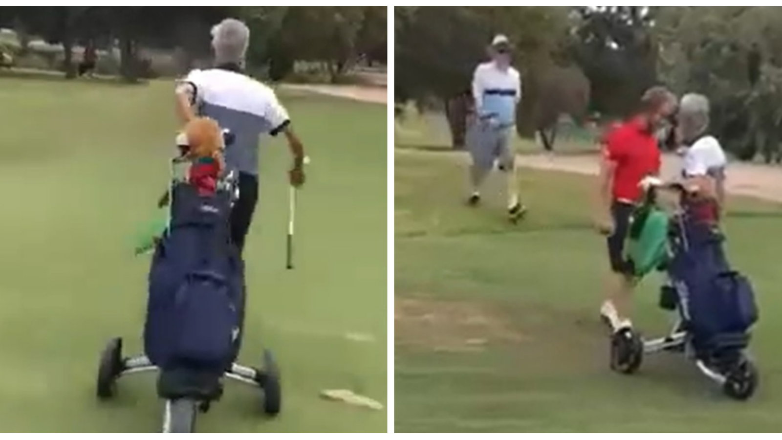 It started with this chap walking across the fairway - pull cart behind him - gesticulating towards the man in red.