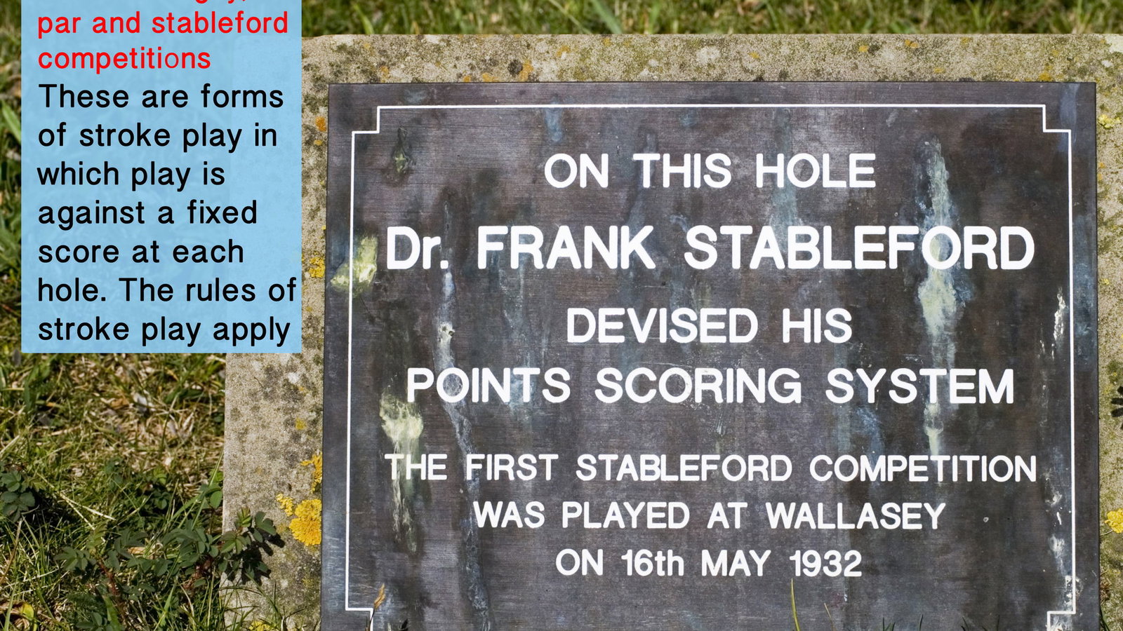Bogey, par and Stableford competitions are forms of stroke play in which play is against a fixed score at each hole. The Rules for stroke play, so far as they are not at variance with the following specific Rules, apply.